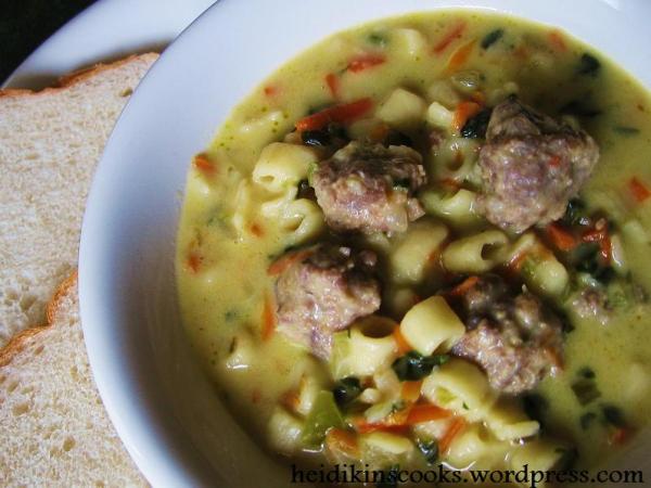 Chop all veggies. Mix up meatballs, I just used my hands. Heat olive oil in large stock pot, saute onion and garlic until soft, add carrots and celery and saute another few minutes. With wet hands, start forming meatballs while the veggies are cooking, make them small–about 3/4″ across. Add chicken stock and milk to veggies and bring to a boil. Drop meatballs into boiling soup, add pasta, let boil about 8 minutes and reduce heat. Let simmer 10-15 minutes. Add spinach, and when the spinach is wilty the soup is done. Garnish with Parmesan cheese.