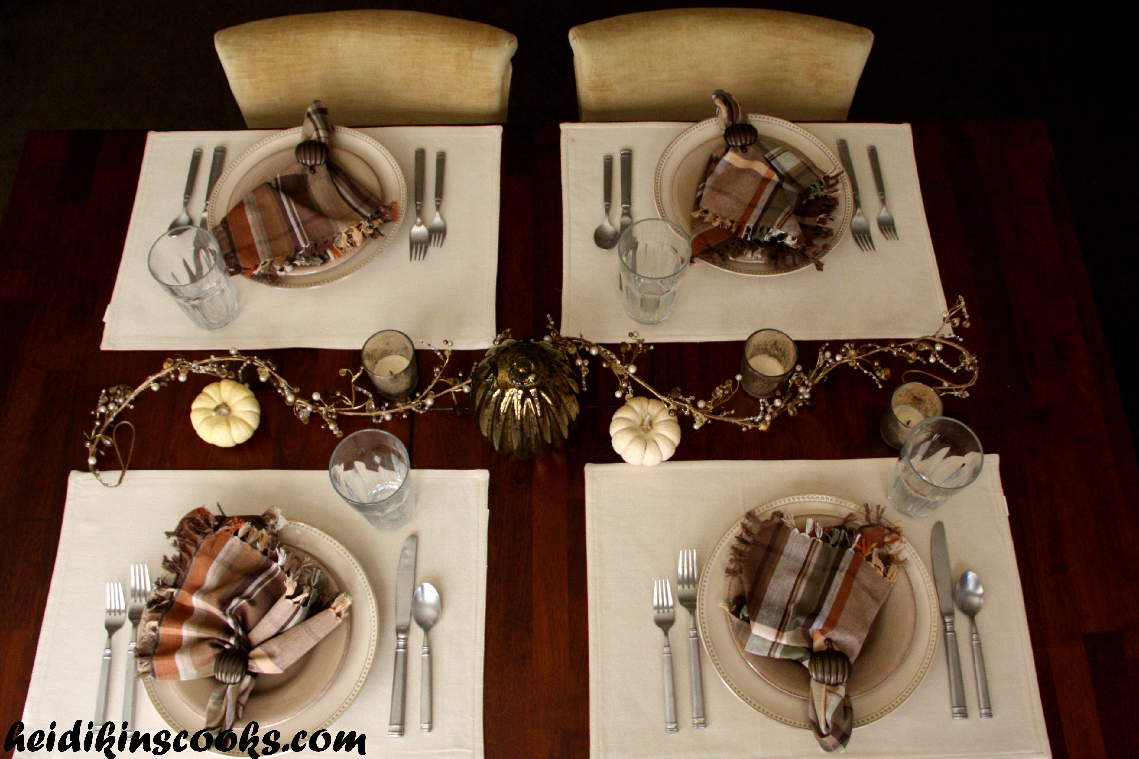 The last several weeks I have been cleaning out nooks and crannies I forgot existed and finding the most wonderful treasures, including about 80% of the items I used to set this table. I had completely forgotten about these mis-matched but complimentary creamy dishes and simple plaid napkins as well as the gold mercury glass pumpkin. I pulled out a few gold-ish votives and bought a few white pumpkins from the grocery store and started arranging things.