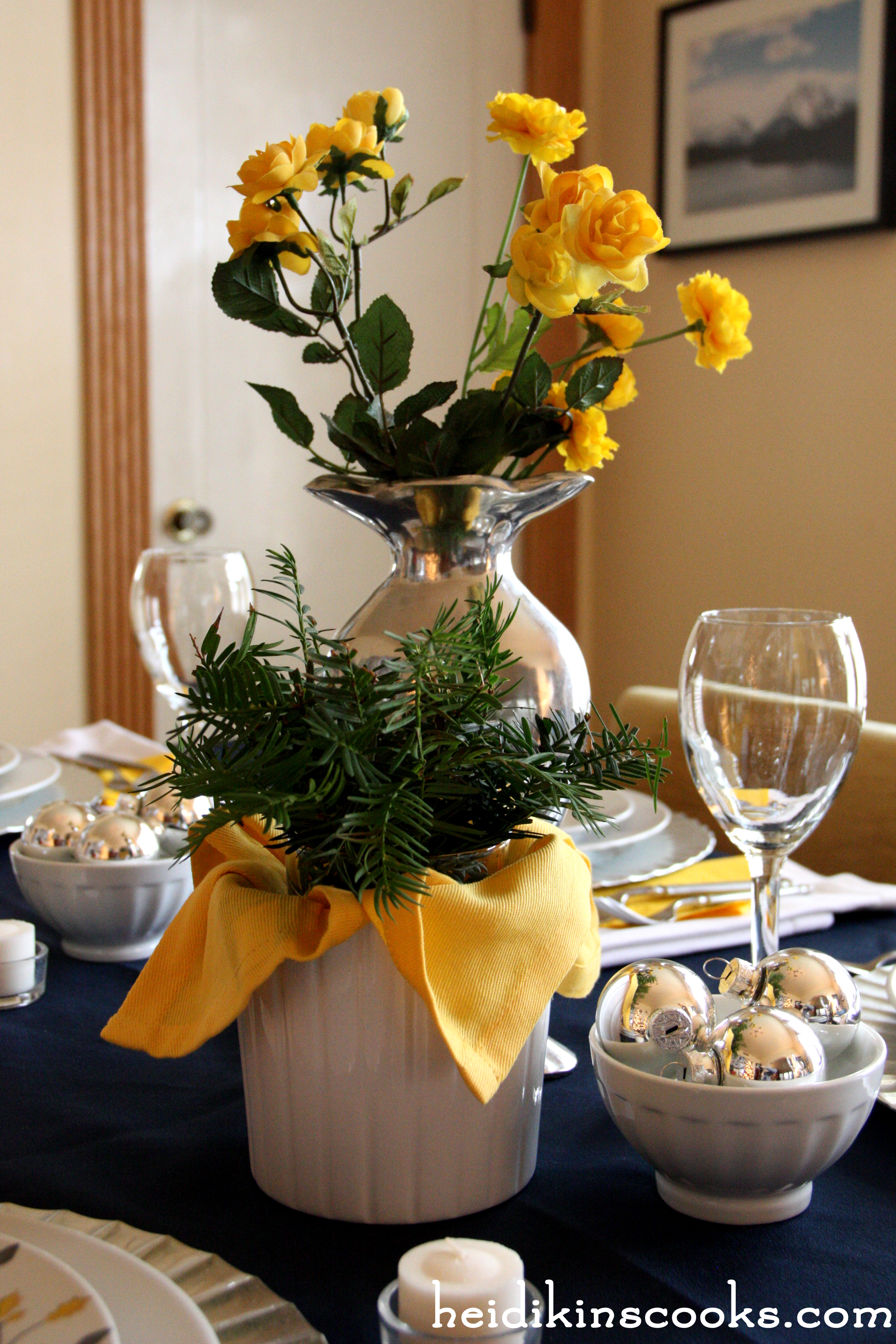 I am all about very simple centerpieces, this is just a handful of dollar-store ornaments in white bowls, 2 sprigs of yellow flowers in a thrifted silver vase, and some Boxwood cuttings with a bright yellow napkin stuffed inside an IKEA pot. And if you want the honest truth, the Boxwood is from last week’s table and has been sitting in a glass cup on my table for 10 days now, still looking lovely.