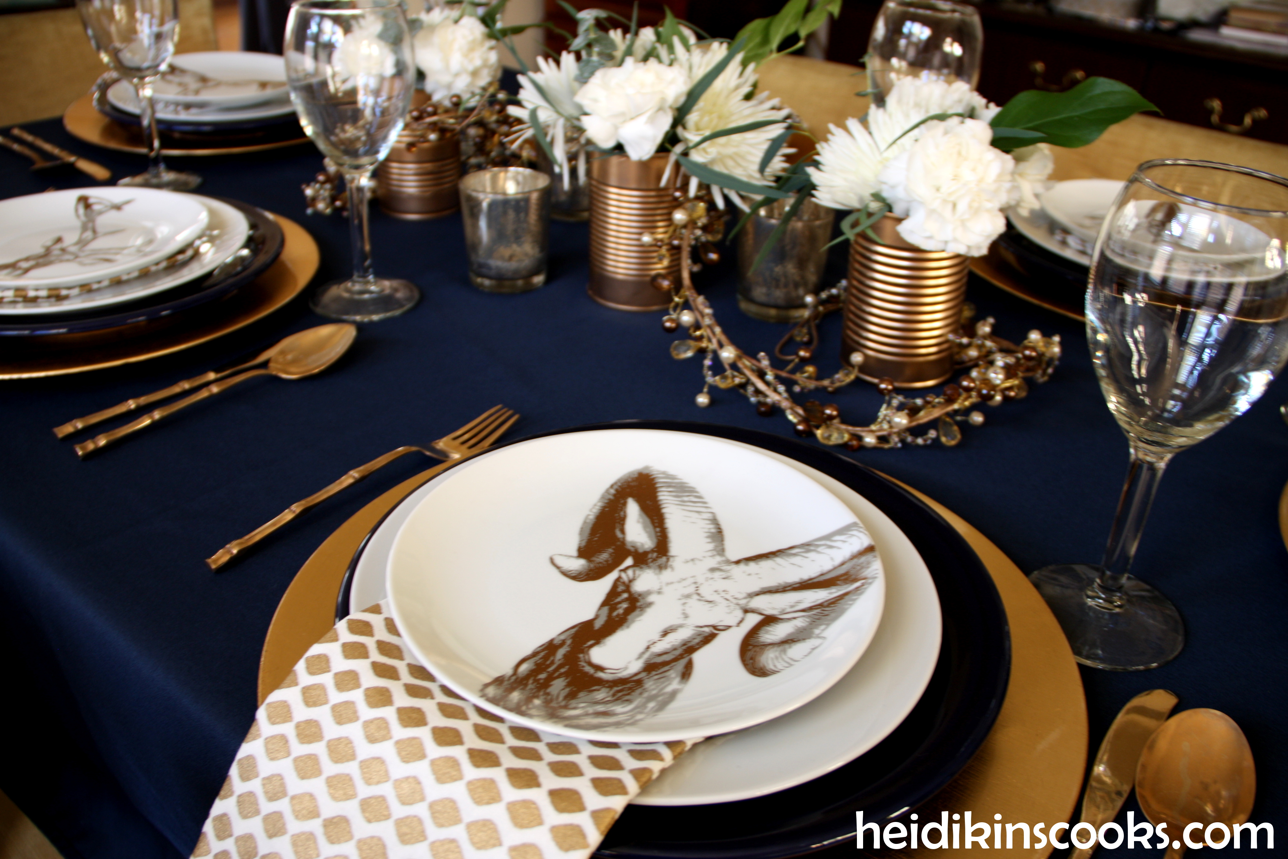 I had very few other things that were gold, but a little gold spray paint, some washed tin cans, and $7.00 of grocery store flowers and greens were the beginning of this lovely, simple centerpiece. The votive candles are old, old, old, and I found the garland on sale at Micheal’s right before Thanksgiving (used in this autumn table setting). I like how the navy tablecloth sets of the gold so nicely, it seems to be the workhorse of these little tablescape adventures!)