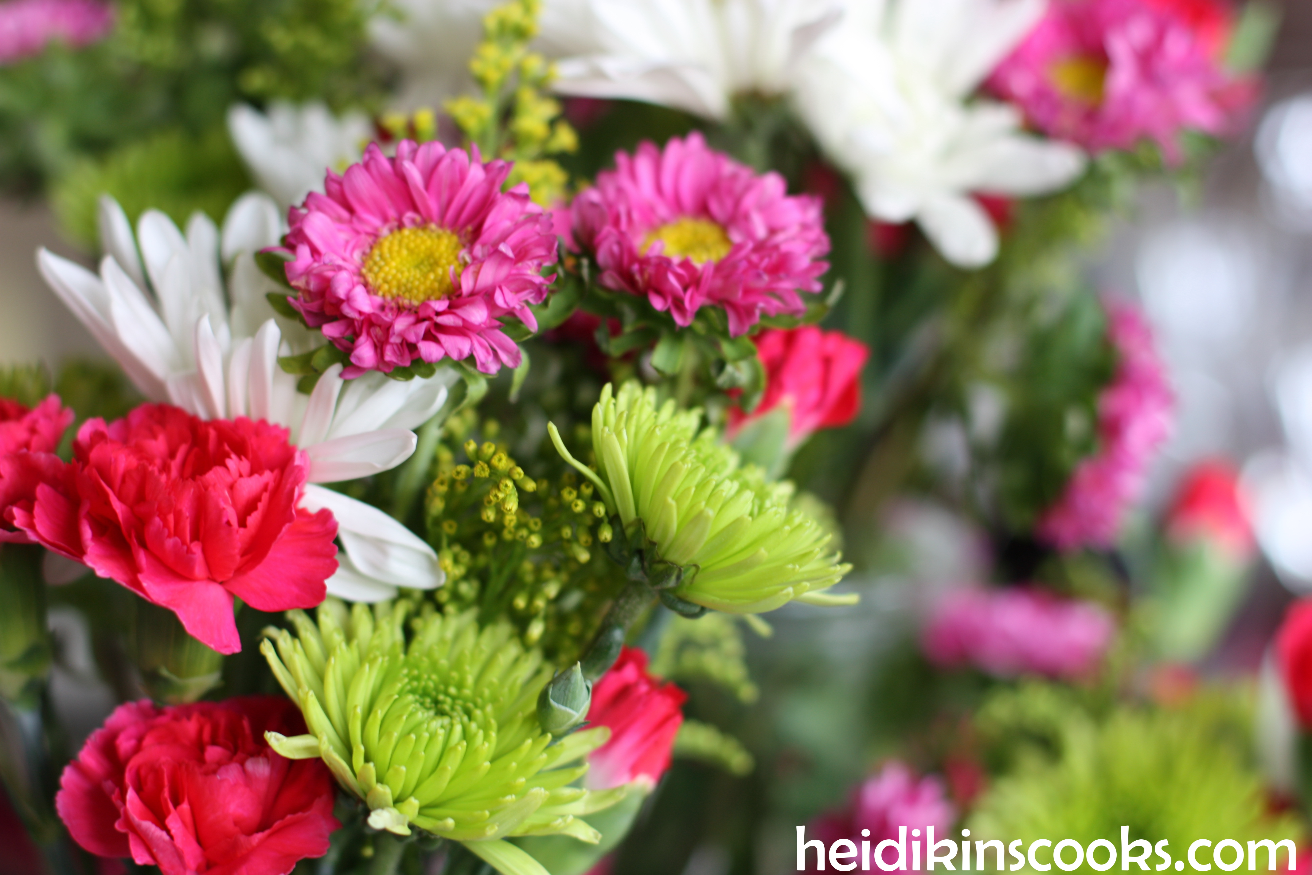 The flowers are about $5 dollars of grocery store flowers on the manager’s special in 4 or 5 glass jars. You don’t have to spend a ton of money on flowers! I think these lasted almost a week, I was careful to trim them and give them fresh water every few days.