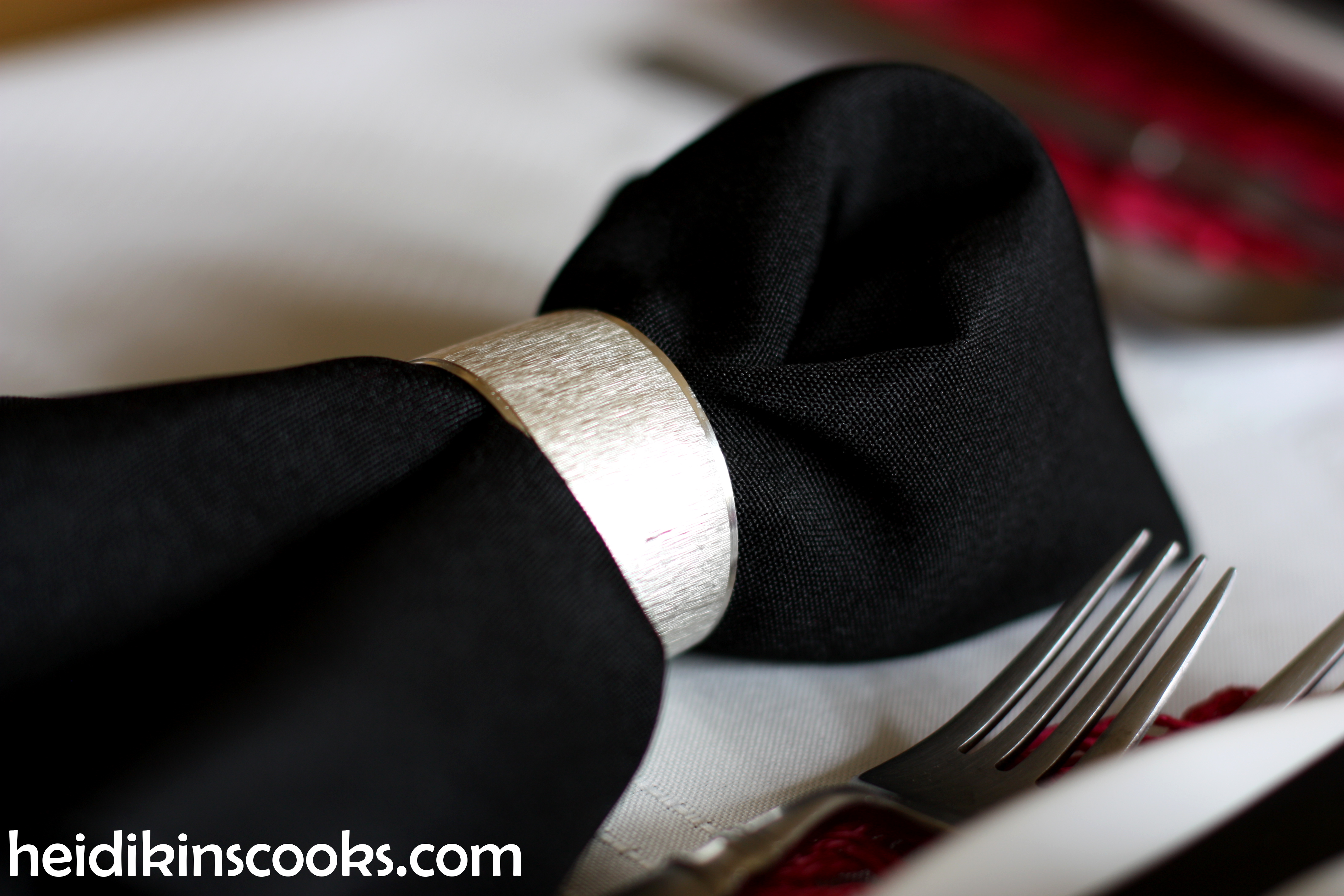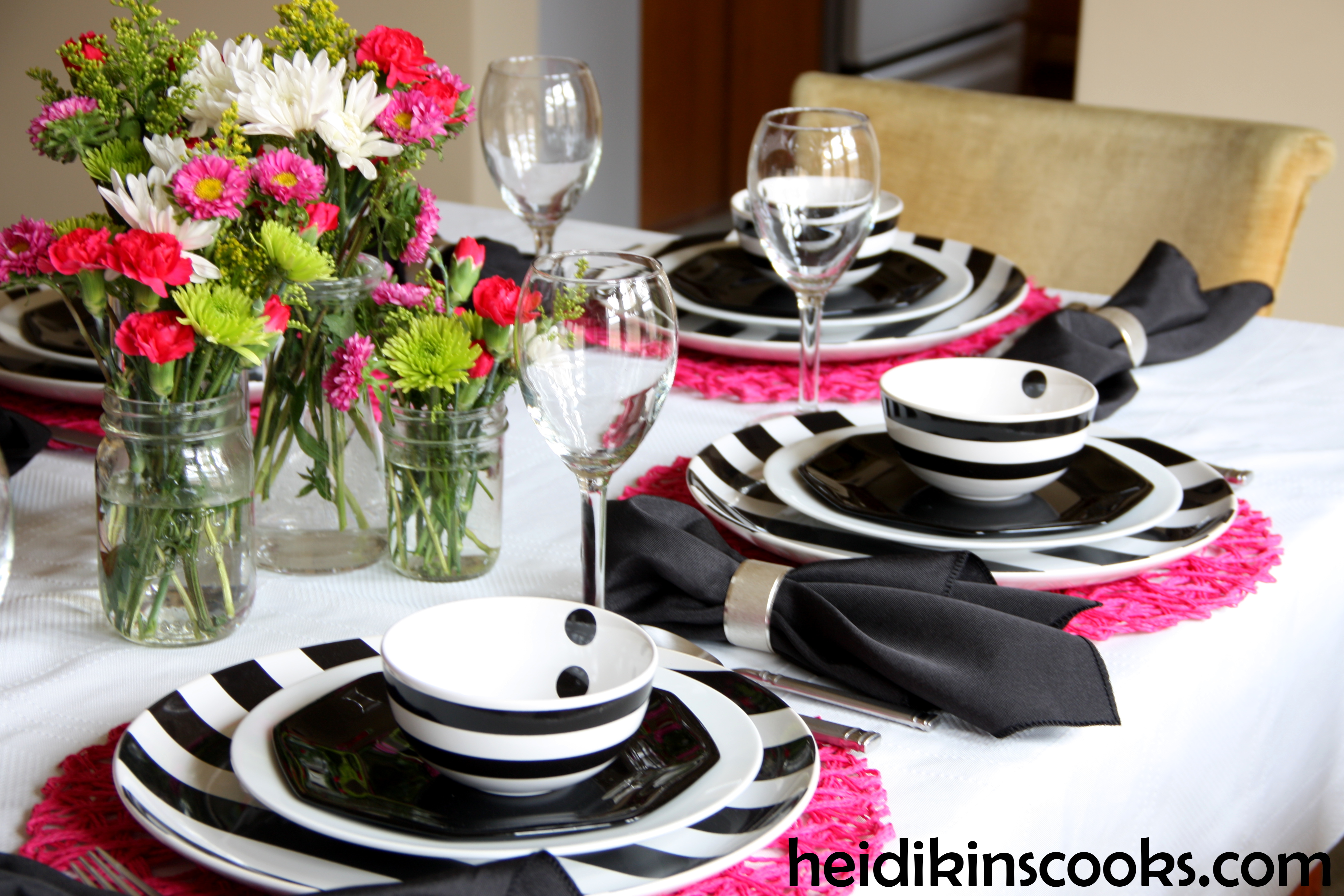 I love Valentine’s Day and I think having all your girlfriends over for a party is the perfect way to celebrate! On a recent trip to IKEA I found these to-do-for black and white stripey plates, and fell head-oven-heels in love. The TICKAR line has a couple other swoony pieces in black and white, but I knew I already had some things at home that would compliment it nicely. So I picked up my plates and bowls and exited as quickly as possible. When I got home I pulled out everything that could go with a black and white theme, and then I saw these hot pink placemats peeking out from their clearance sale bag. Boom! Perfect Valentine’s Day dinner party!