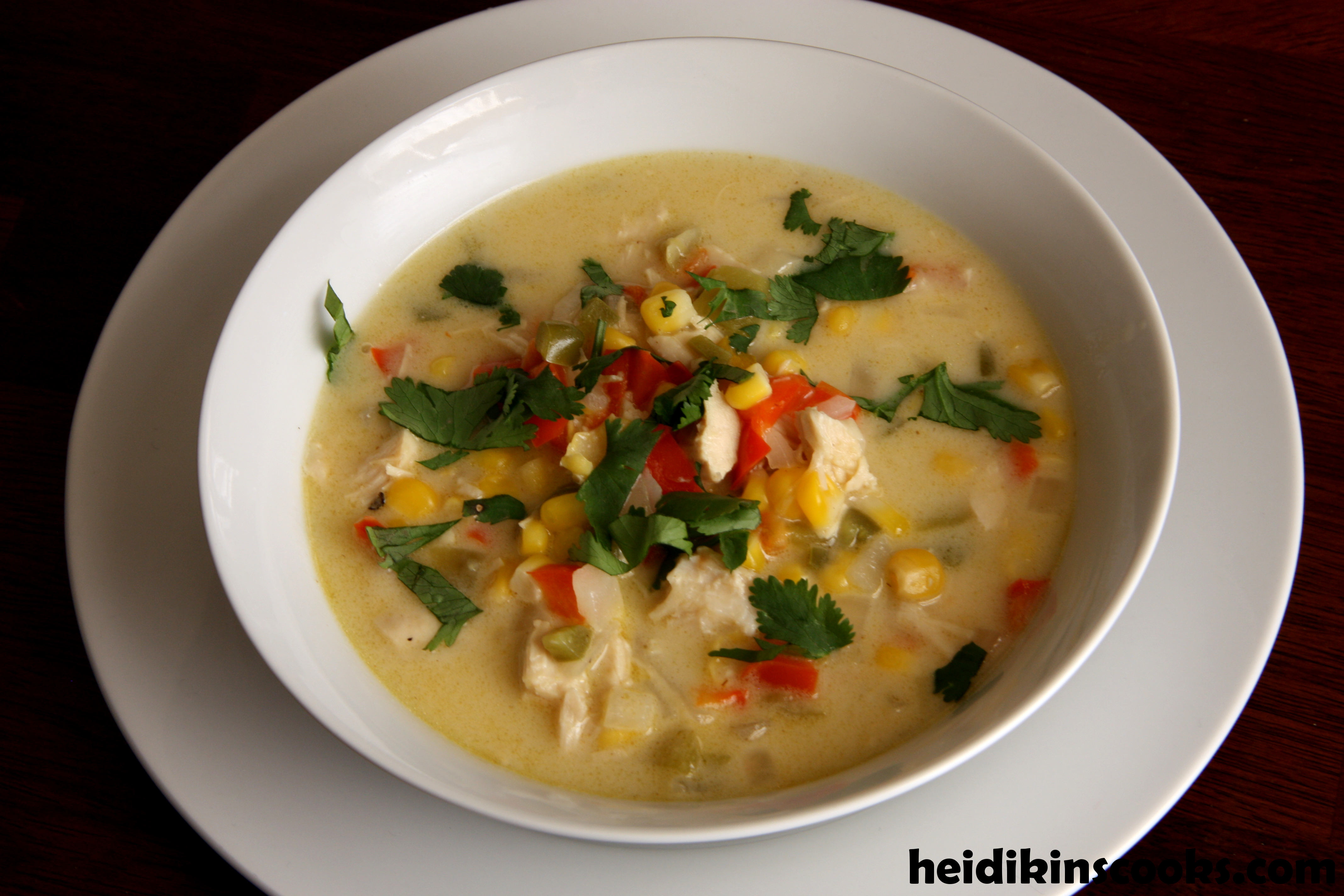 Make a roux by melting 3 tablespoons butter in small saucepan on high heat, when it’s melted add flour and whisk to make a paste. Add milk and whisk constantly until it bubbles and gets thick. Remove from heat and add feta, whisking until mostly smooth (a few lumps are okay). Add the milk-feta mixture to your soup pot, dump in the frozen corn and chicken/turkey, if using, and bring to a boil. Reduce heat and simmer 20-30 minutes. Served with chopped cilantro.