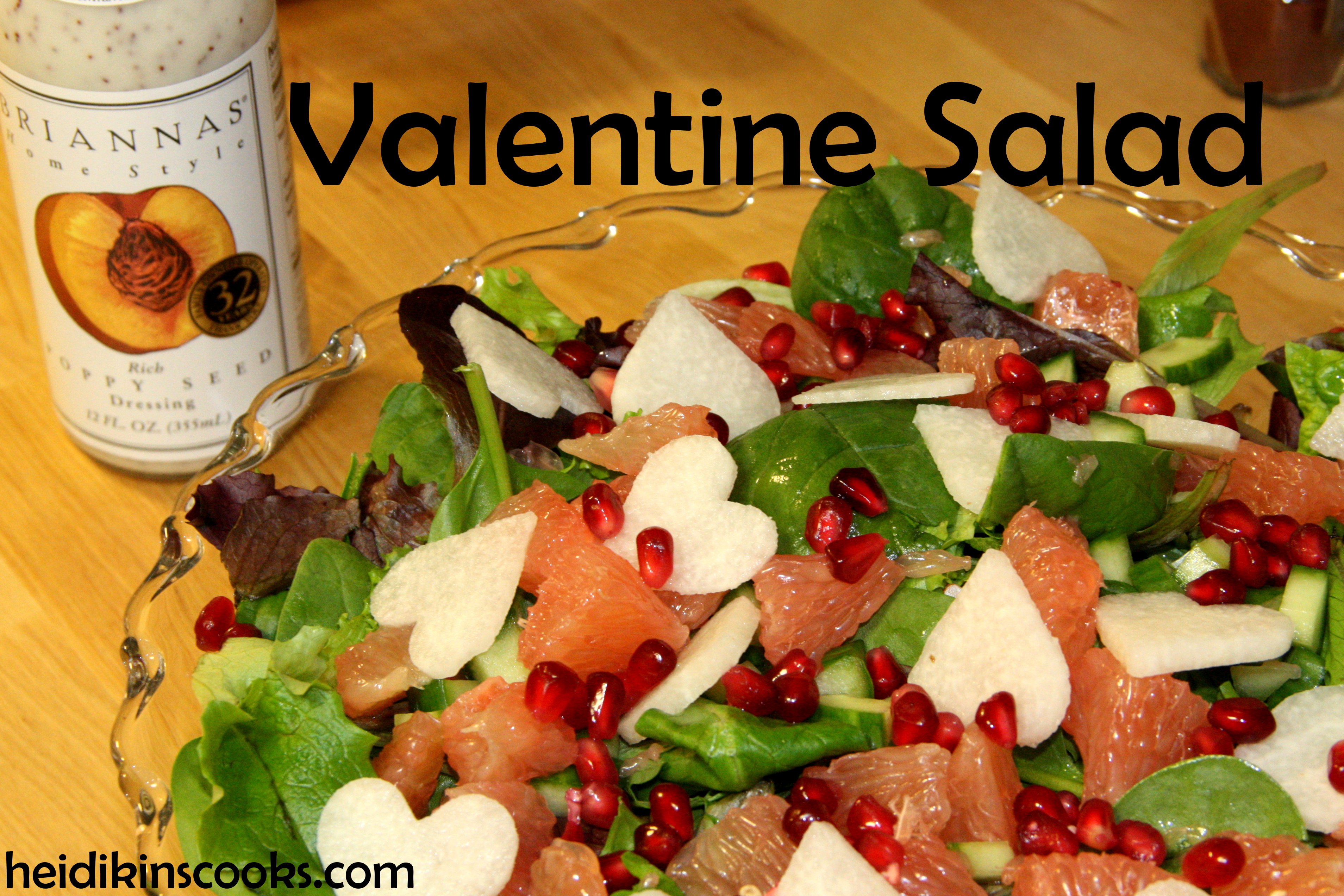 I love Valentine’s Day, and have always loved Valentine’s Day. Not in a swoony, romantic, fancy-pants date with flowers and chocolates and jewelry kind of way, but in a heart and pink and red and cookies kind of way. To be honest, my favorite Valentine’s Day date is a night home with my sweetheart, my favorite delivery pizza (Papa Johns, I’ll never quit your crust!) and a movie that makes me laugh. This salad, with it’s pink grapefruit, red pomegranate seeds, and adorable white jicama hearts, is probably the most Valentine-y thing I’ve ever made outside of frosted sugar cookies; it would be a great side to your romantic steak or lobster dinner. And hey, it probably would also go really great with pizza.